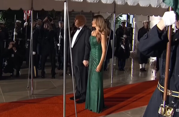 این لباس دکلته با چین‌های کلاسیک در بالاتنه و دامن، در زیر نورهای کاخ سفید درخشش ویژه‌ای داشت و یک چاک ظریف در قسمت جلو، ظاهر او را مدرن‌تر کرده بود. ملانیا برای تکمیل استایل خود از گوشواره‌های الماس و کفش‌های نوک‌تیز استفاده کرد و با آرایش ملایم و موج‌های حجیم در مو، ظاهر خود را ساده اما لوکس نگه داشت.